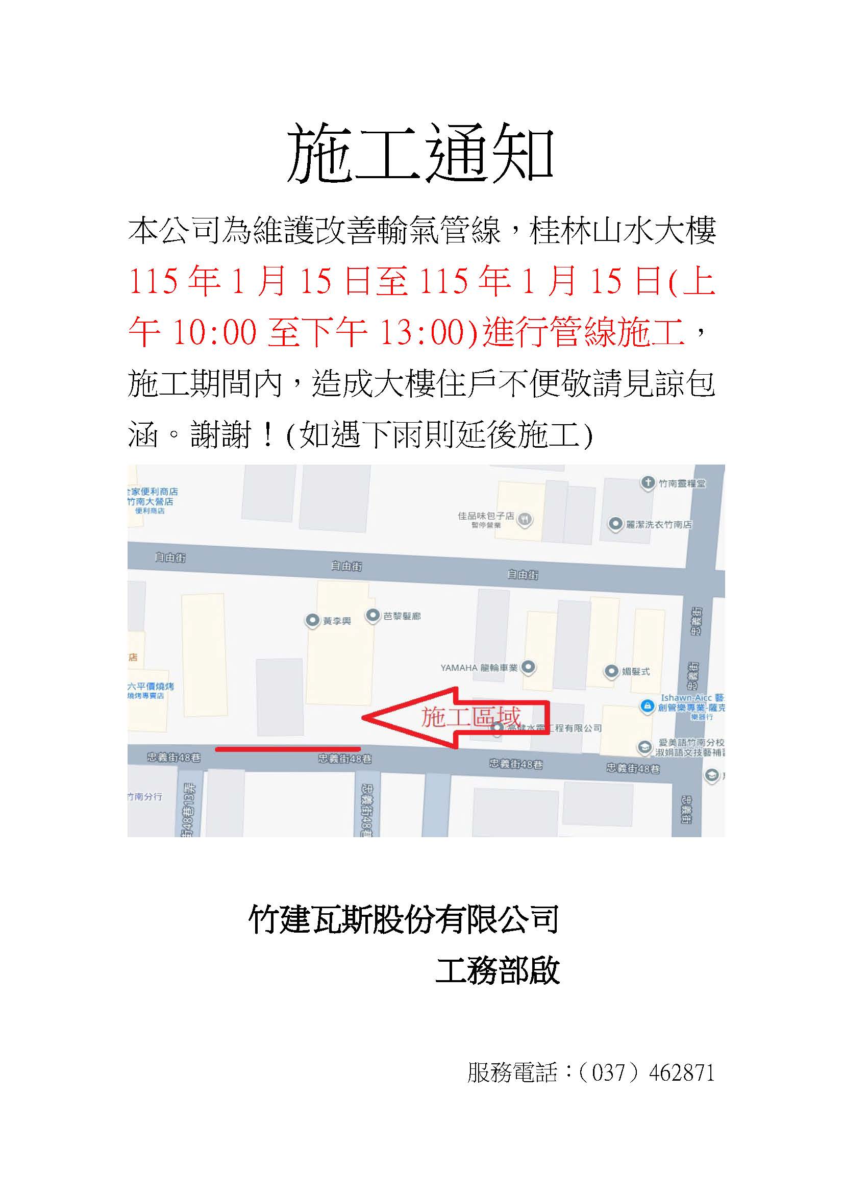 工程施工停氣範圍公告-忠義街48巷桂林山水大樓